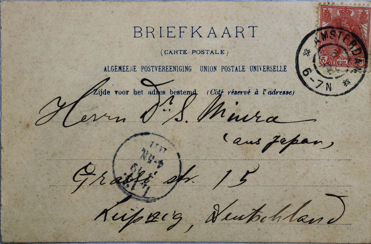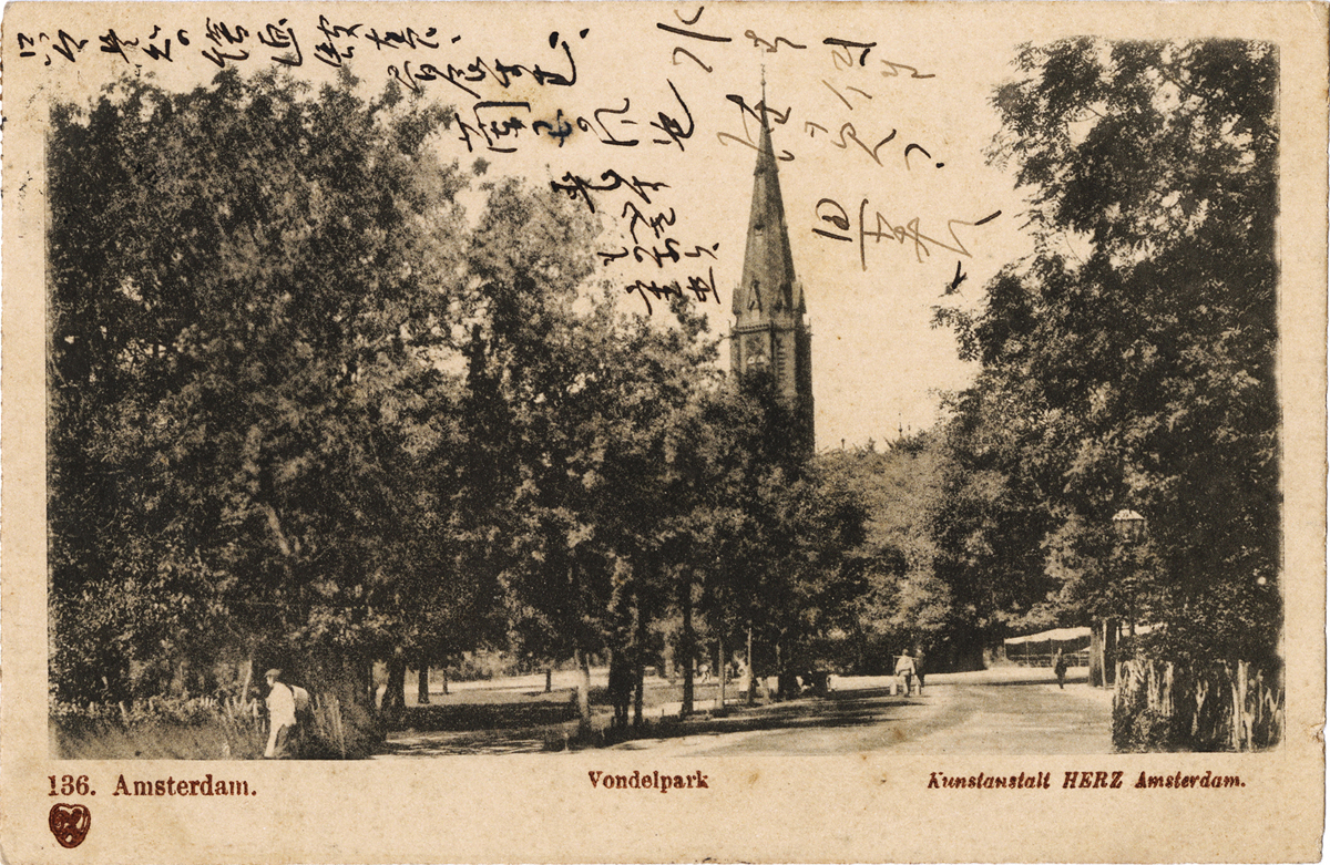 - 内容:只今当地の絵画館を見た。蘭国の風色愛すべきものあり。水より低い陸を見た。/絵種別:写真/絵分類:風景/絵国名:オランダ/絵内容:アムステルダム|フォンデル公園/絵作者・発行社:kunstanstalt Amsterdam/絵柄の種類:風景(その他)/留学期間:ライプチヒ大学時代/三浦と葉書の関係:三浦宛