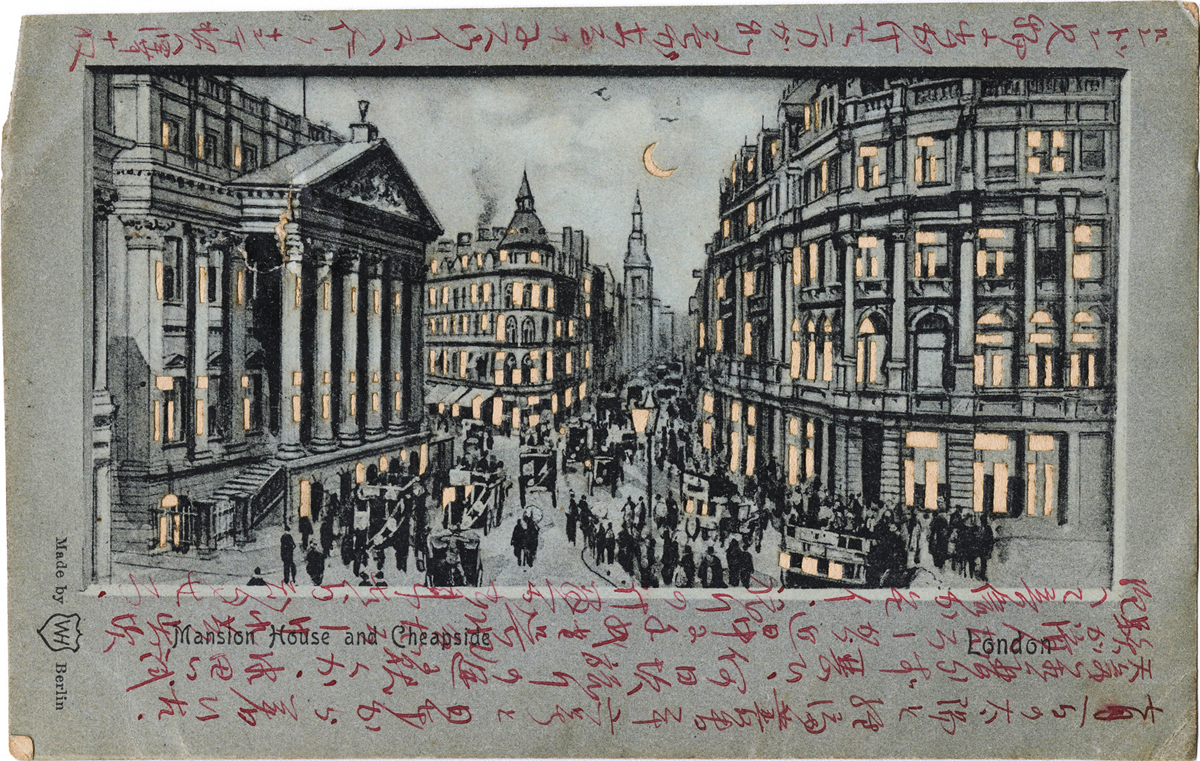 - 内容:雑誌『太陽』と『経済叢書第26号』が日本から到着。旅行にはいつ発つのか。津田は試験が終わったろう。/絵種別:写真/絵分類:風景/絵国名:イギリス/絵内容:ロンドン|マンションハウス|チープサイド|夜景|月|透かし/絵作者・発行社:WH/絵柄の種類:風景(その他)/留学期間:ライプチヒ大学時代/三浦と葉書の関係:三浦宛