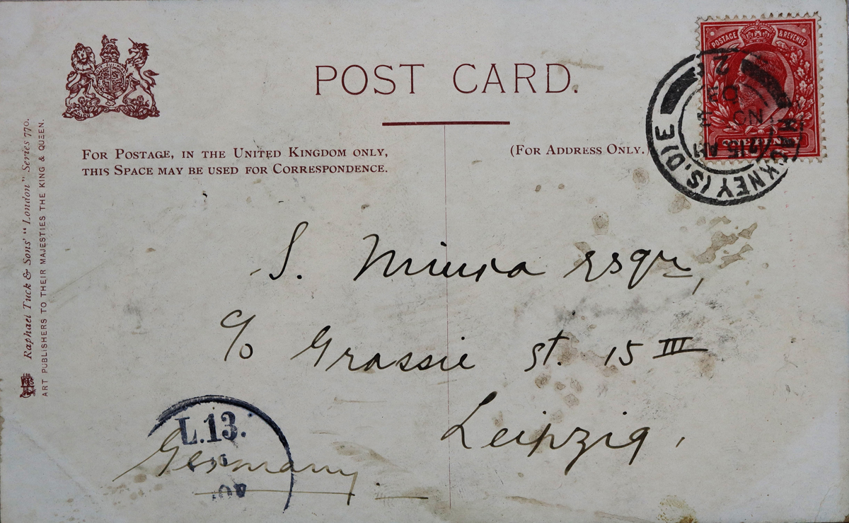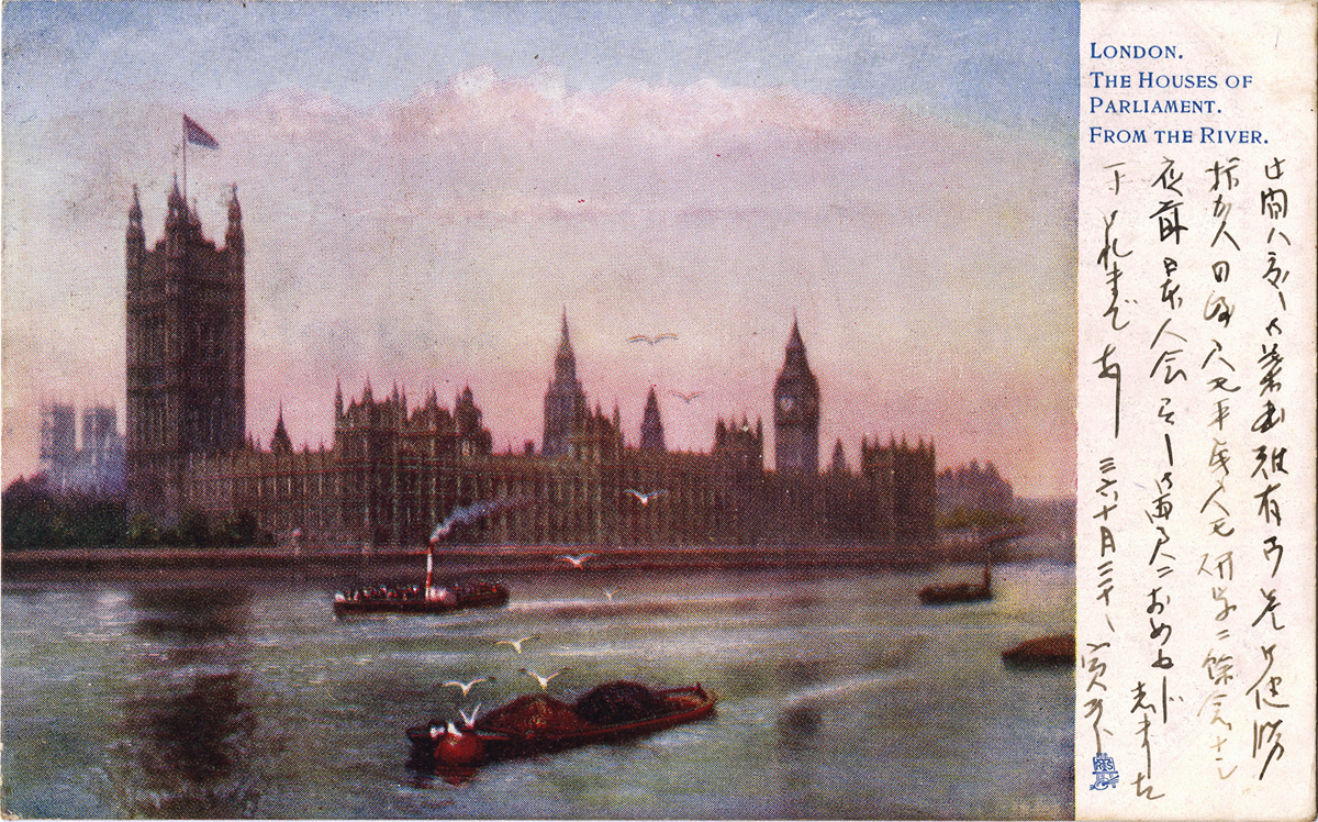 - 内容:近況報告。日本人会で田崎・平尾両君に会った。/絵種別:写真/絵分類:風景/絵国名:イギリス/絵内容:ロンドン|ウェストミンスター寺院/絵柄の種類:風景(その他)/留学期間:ライプチヒ大学時代/三浦と葉書の関係:三浦宛