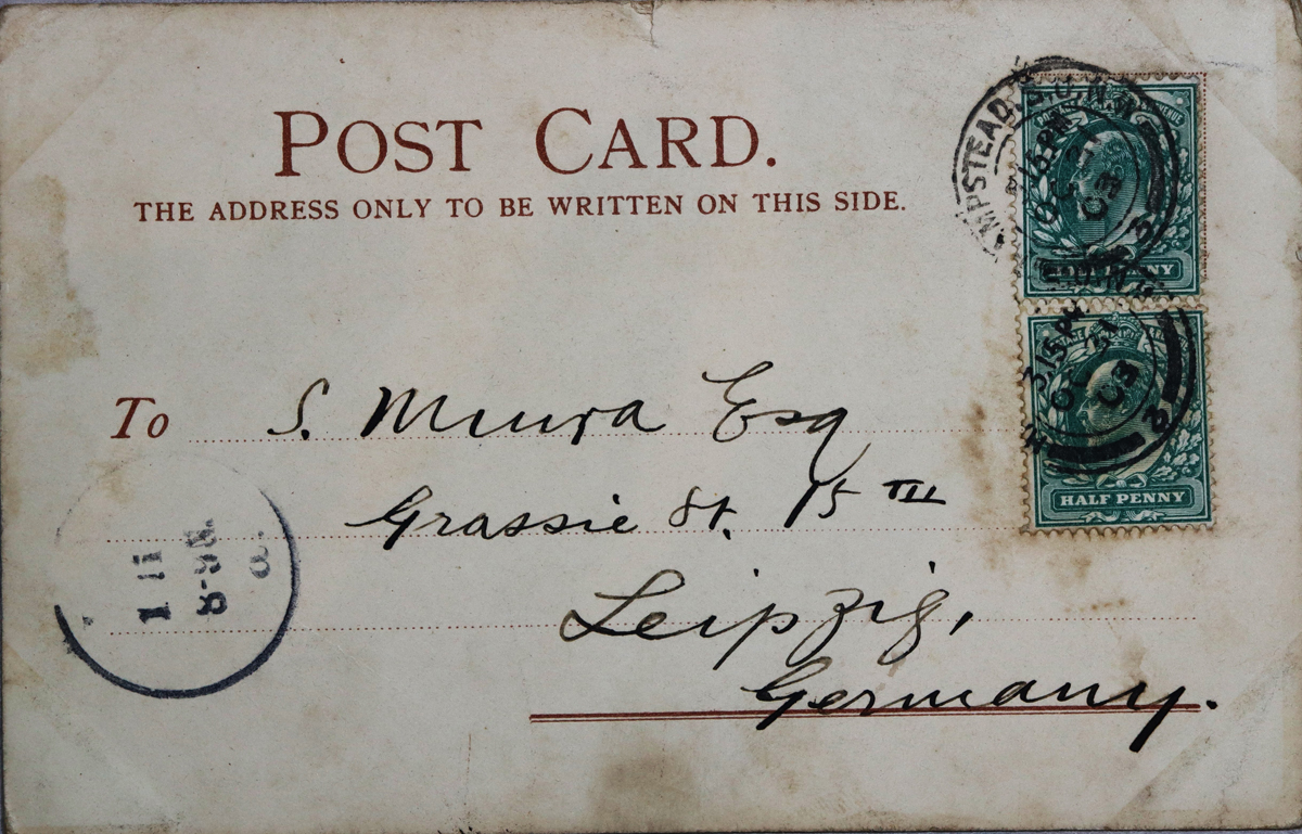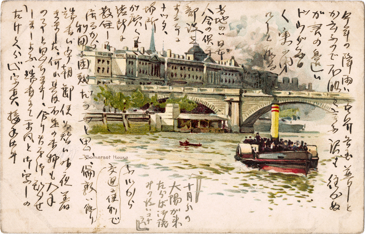 - 内容:世界的な降雨。君の所はどうだ。当地には日本人倶楽部ができる。/絵種別:絵/絵分類:風景/絵国名:イギリス/絵内容:サマセットハウス|テムズ川|運河/絵柄の種類:風景(その他)/留学期間:ライプチヒ大学時代/三浦と葉書の関係:三浦宛