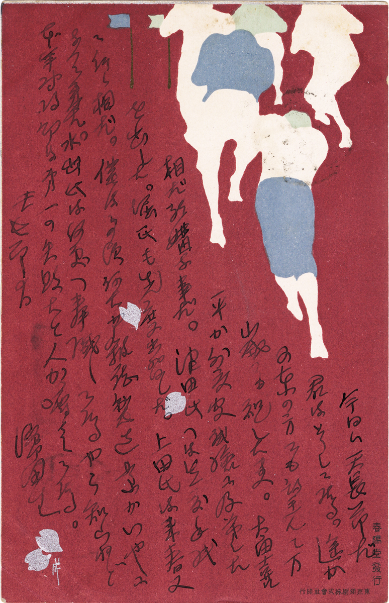 - 内容:上田、津田、水出氏らの消息。/絵種別:イラスト/絵分類:文化/絵国名:日本/絵内容:男性|競争|桜の花びら/絵作者・発行社:春陽堂、東京印刷株式会社/絵柄の種類:文化/留学期間:ライプチヒ大学時代/三浦と葉書の関係:三浦宛
