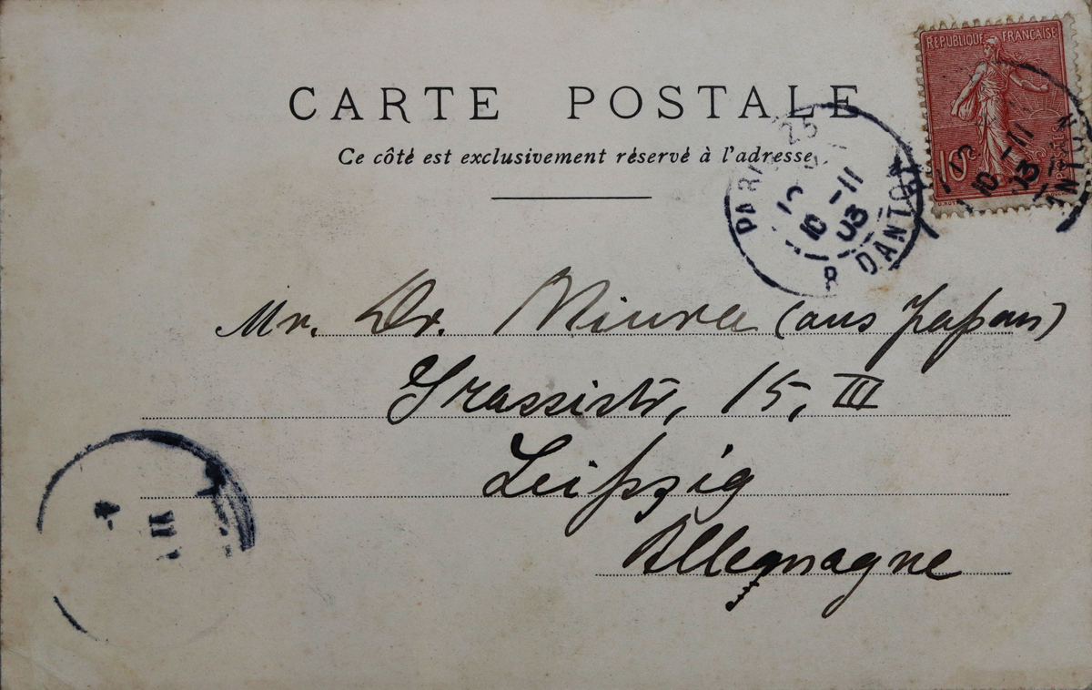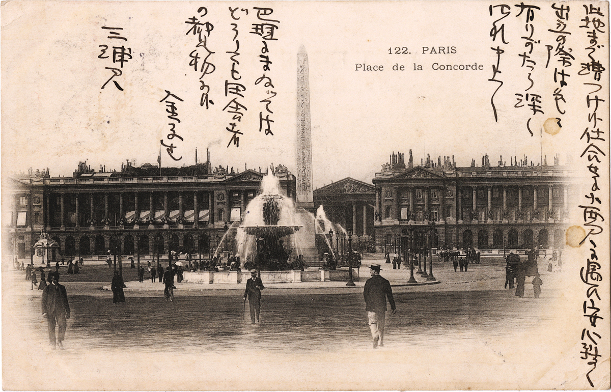 - 内容:パリ到着。小西君に遇った。安心した。パリでは田舎者の都見物だ。/絵種別:写真/絵分類:風景/絵国名:フランス/絵内容:パリ|コンコルド広場|モニュメント|噴水/絵柄の種類:風景(その他)/留学期間:ライプチヒ大学時代/三浦と葉書の関係:三浦宛
