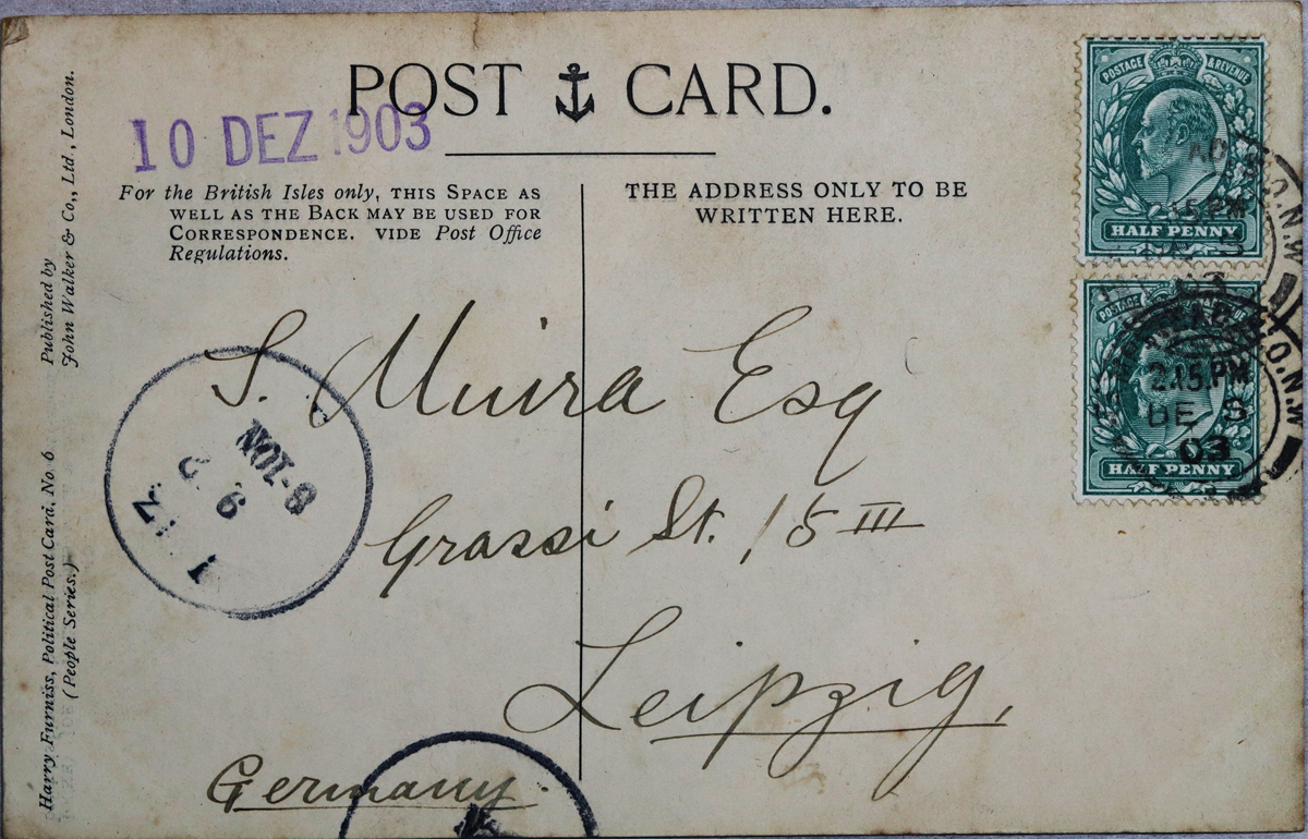 内容:青地君の書物を調査し、彼の不足分4冊が見つからない。見つけたら送る。霧で閉口。/絵種別:絵/絵分類:文化/絵国名:イギリス/絵内容:戯画|風刺画|馬|騎士/絵柄の種類:文化/留学期間:ライプチヒ大学時代/三浦と葉書の関係:三浦宛