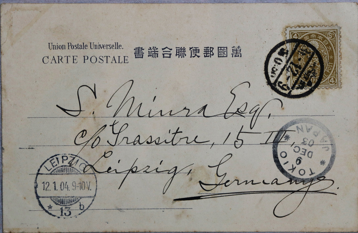 - 内容:年賀状。/絵種別:写真/絵分類:文化/絵国名:日本/絵内容:年賀状|花|キク/絵柄の種類:文化/留学期間:ライプチヒ大学時代/三浦と葉書の関係:三浦宛