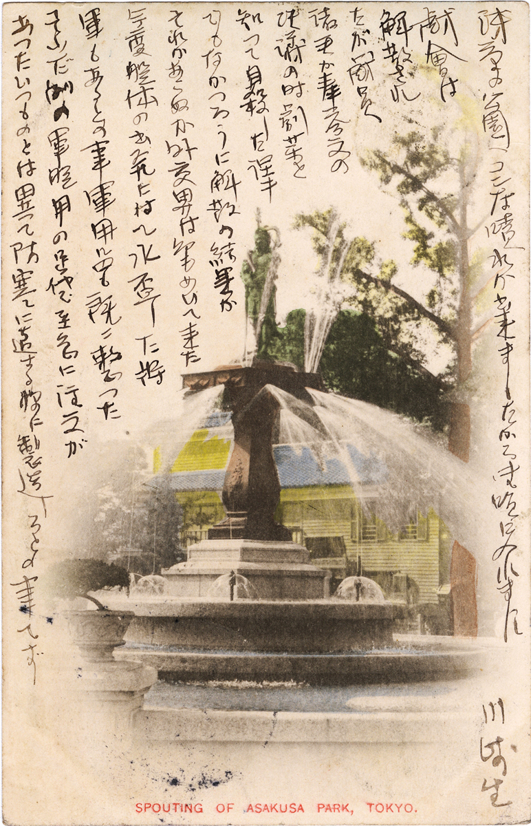 - 内容:議会の解散、軍用品調達など日本の政治動向についての報告。/絵種別:写真/絵分類:風景/絵国名:日本/絵内容:東京|浅草公園|噴水/絵柄の種類:風景(日本)/留学期間:ライプチヒ大学時代/三浦と葉書の関係:三浦宛