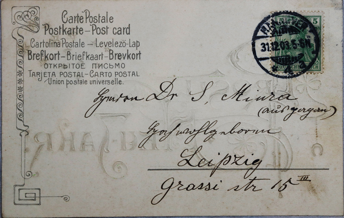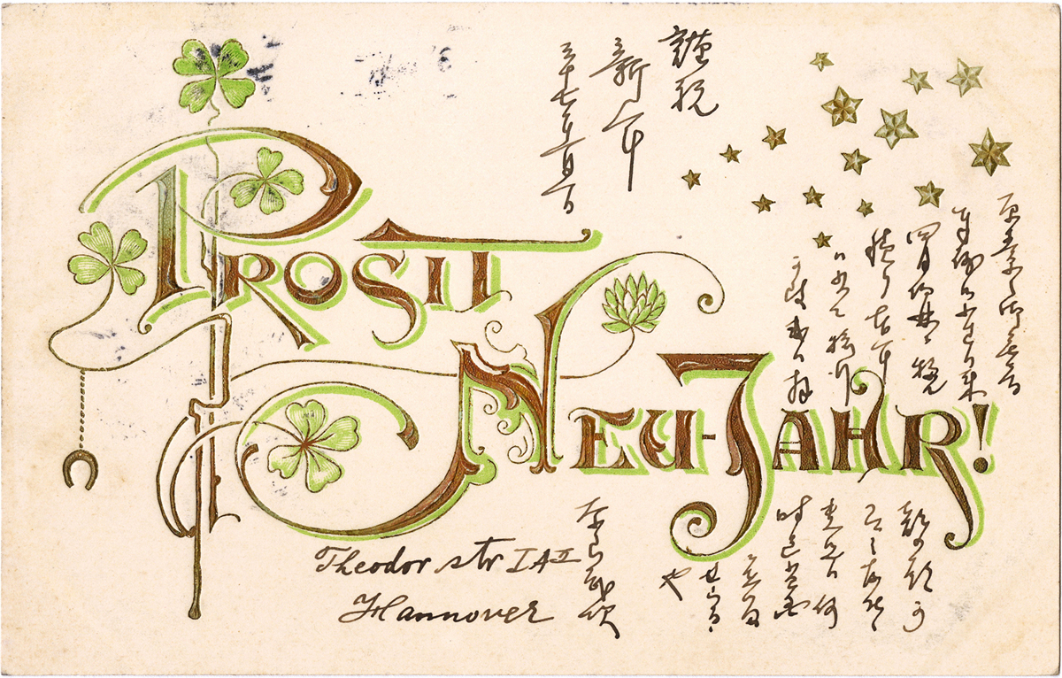 - 内容:年賀状。4月伯林に移るつもり。/絵種別:イラスト/絵分類:文化/絵国名:ドイツ/絵内容:年賀状|植物|クローバー|四つ葉|prosit neujahr|デザイン/絵柄の種類:文化/留学期間:ライプチヒ大学時代/三浦と葉書の関係:三浦宛