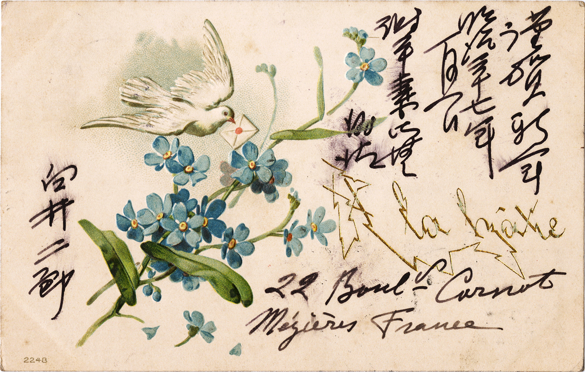 - 内容:謹賀新年。/絵種別:イラスト/絵分類:文化/絵国名:ドイツ/絵内容:鳩|花|ワスレナグサ|手紙/絵柄の種類:文化/留学期間:ライプチヒ大学時代/三浦と葉書の関係:三浦宛