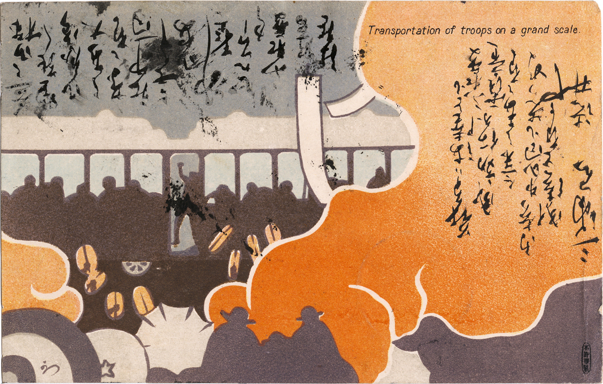 - 内容:日露戦争は海陸とも成功。/絵種別:絵/絵分類:文化/絵国名:日本/絵内容:大規模兵員輸送|汽車|満員|蒸気機関車|デザイン/絵柄の種類:文化/留学期間:ライプチヒ大学時代/三浦と葉書の関係:三浦宛