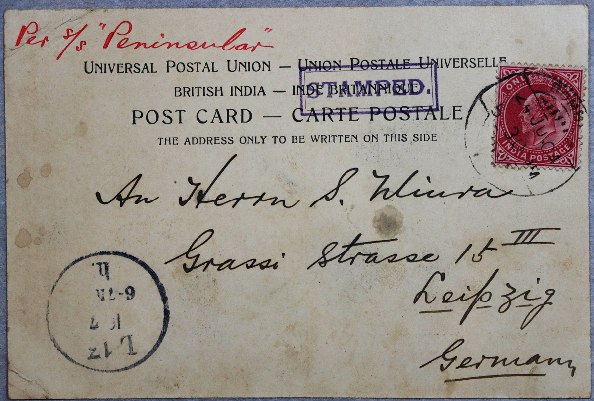 - 内容:挨拶状。堀兄ベルリンへ発つ写真。三兄に会った心地だ。奈佐さんの住所教えてくれ給え。/絵種別:写真/絵分類:風景/絵国名:インド/絵内容:ボンベイ|ヴィクトリアガーデン|/絵柄の種類:風景(その他)/留学期間:ライプチヒ大学時代/三浦と葉書の関係:三浦宛
