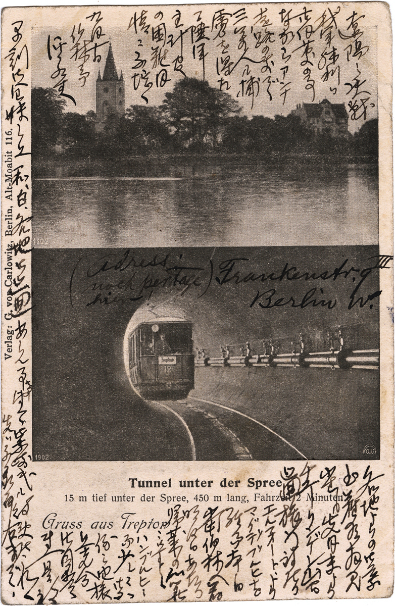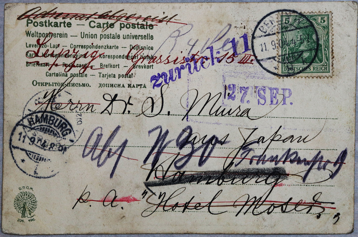 - 内容:近況報告。日露戦争について三万人の捕虜を得た陸軍主計官の困難、同情に絶えず…。/絵種別:絵/絵分類:風景/絵国名:ドイツ/絵内容:地下鉄|川|教会|組絵/絵作者・発行社:G.von Carlowitz,Berlin/絵柄の種類:風景(ドイツ)/留学期間:ライプチヒ大学時代/三浦と葉書の関係:三浦宛
