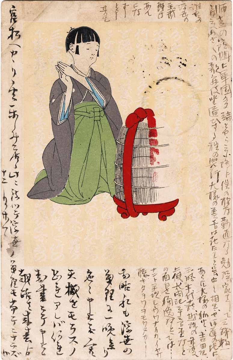 - 内容:近況報告。演劇情報。/絵種別:イラスト/絵分類:文化/絵国名:日本/絵内容:千松|歌舞伎|伽羅先代萩|義太夫/絵柄の種類:文化/留学期間:ライプチヒ大学時代/三浦と葉書の関係:三浦宛