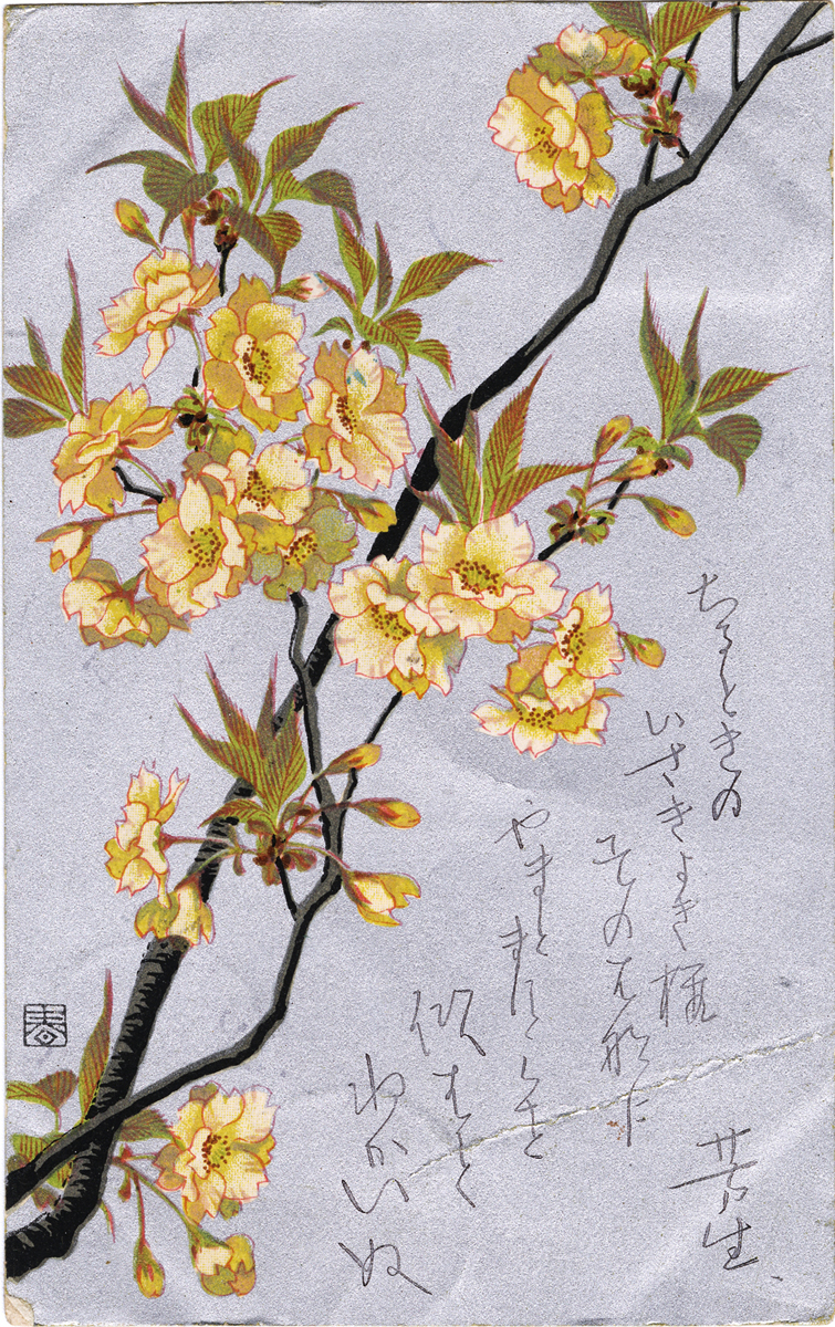 - 内容:「ちるときの いさぎよき桜 そのはなに やまとますらを 似むとねがいぬ」/絵種別:絵/絵分類:文化/絵国名:日本/絵内容:桜花/絵柄の種類:文化/留学期間:ミュンヘン大学時代/三浦と葉書の関係:三浦宛