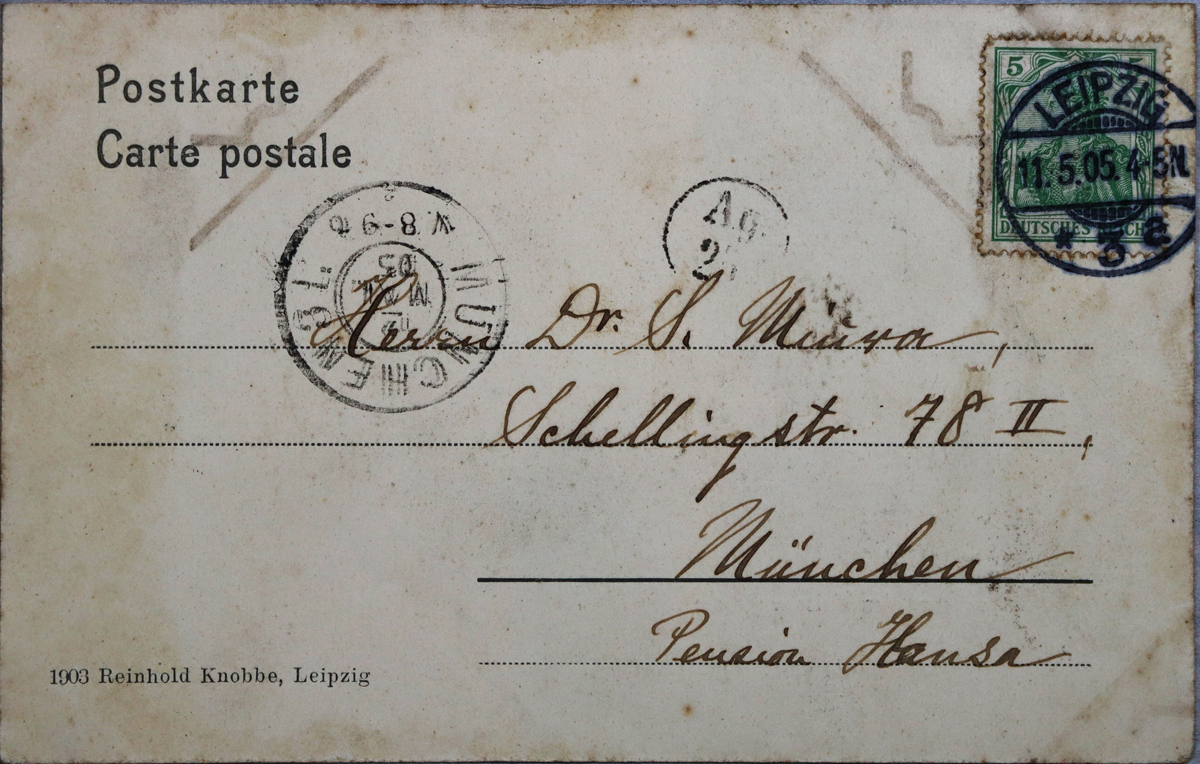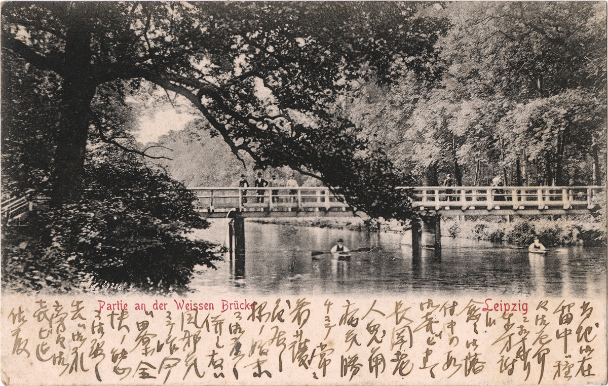 - 内容:近況報告。当地御在留中はお世話になった。長岡氏は風邪気味だったが全快。/絵種別:写真/絵分類:風景/絵国名:ドイツ/絵内容:ライプツィヒ|WeißeBrücke/絵柄の種類:風景(ドイツ)/留学期間:ミュンヘン大学時代/三浦と葉書の関係:三浦宛