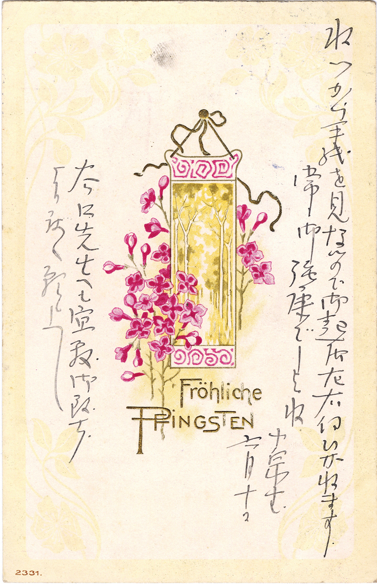 - 内容:此頃手紙を見ていないので、御起居左右伺いかねる。谷口先生によろしく!/絵種別:イラスト/絵分類:文化/絵国名:ドイツ/絵内容:花|Fröhliche Pfingften|デザイン/絵柄の種類:文化/留学期間:ミュンヘン大学時代/三浦と葉書の関係:三浦宛