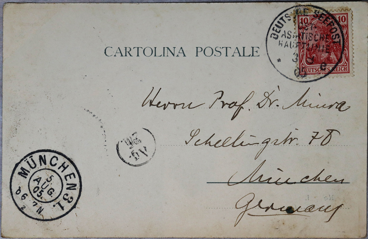 - 内容:<ドイツ語文章>/絵種別:写真/絵分類:風景/絵国名:イタリア/絵内容:ナポリ|ヴェスヴィオ火山|船/絵柄の種類:風景(その他)/留学期間:ミュンヘン大学時代/三浦と葉書の関係:三浦宛