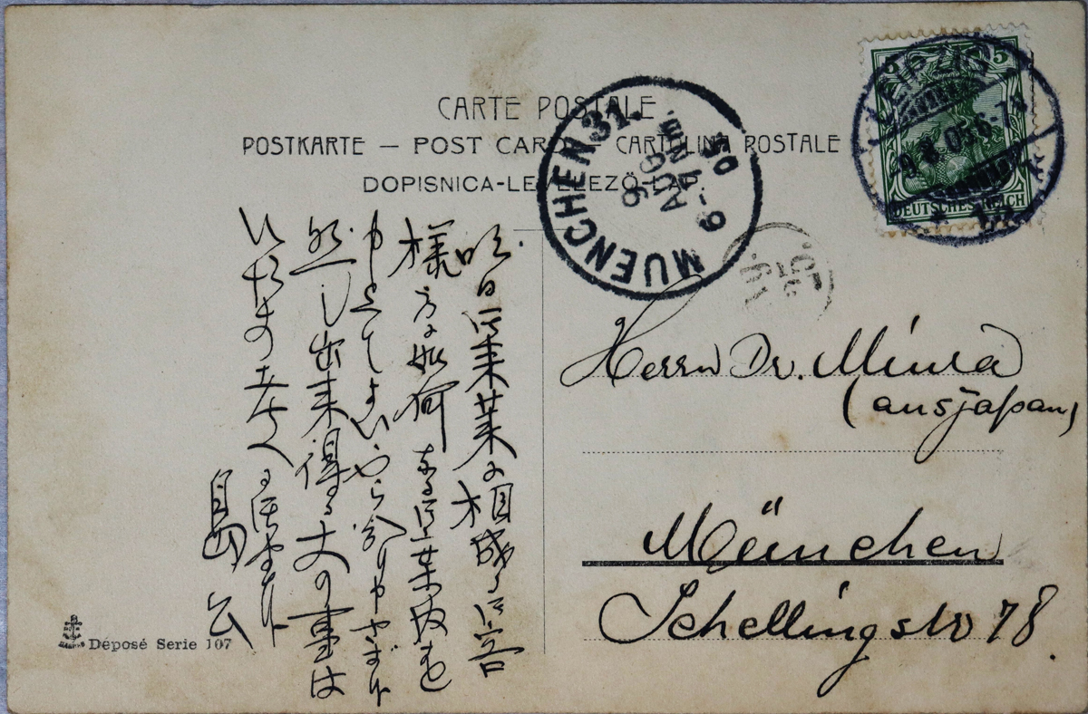 - 内容:明日ライプチッヒに来る客にどのようなご案内をしたらよいか(表)。近況報告(裏)。/絵種別:イラスト/絵分類:文化/絵国名:ドイツ/絵内容:女性|花|デザイン|スイセン/絵柄の種類:文化/留学期間:ミュンヘン大学時代/三浦と葉書の関係:三浦宛