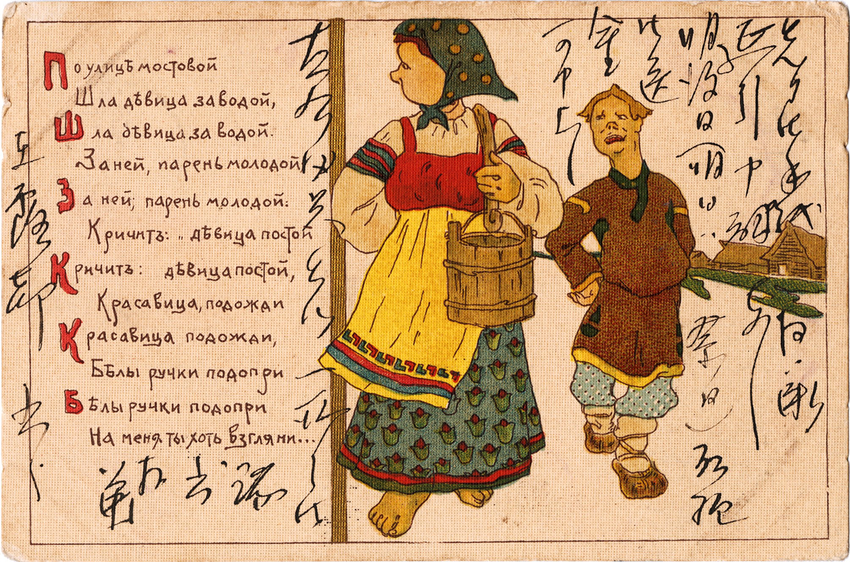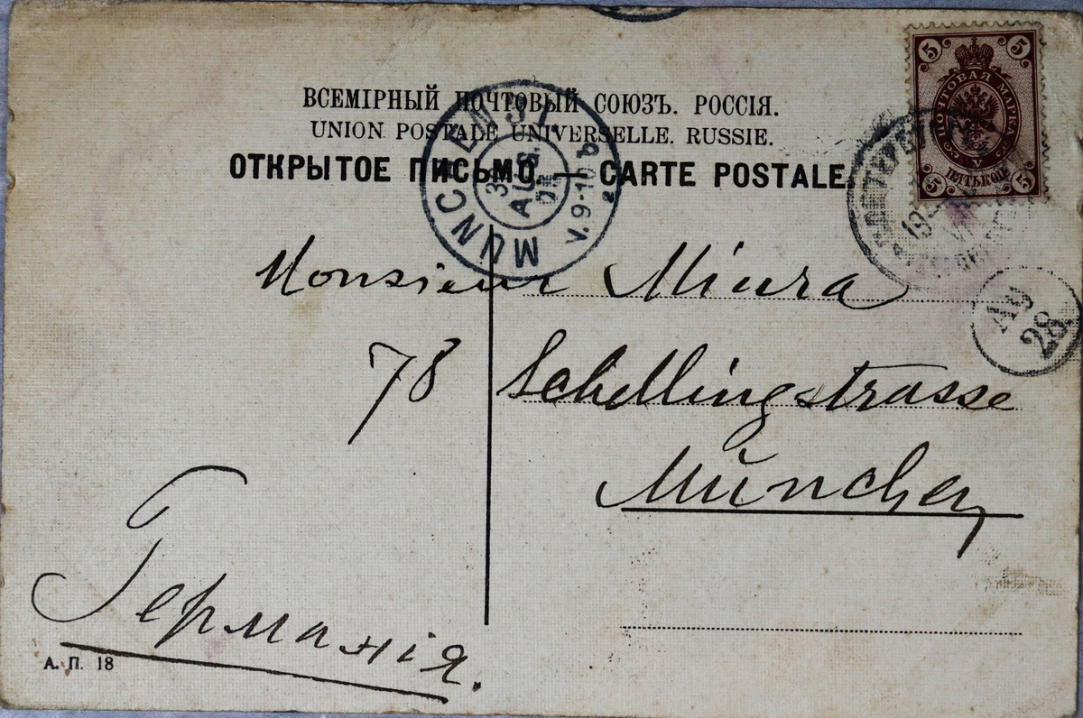 - 内容:手紙拝受、延び延びになっていた送金、明後日(明日は祭日)送る。左右田君と一緒のおハガキを拝誦。/絵種別:絵/絵分類:文化/絵国名:ロシア/絵内容:戯画|女性|少年|桶/絵柄の種類:文化/留学期間:ミュンヘン大学時代/三浦と葉書の関係:三浦宛
