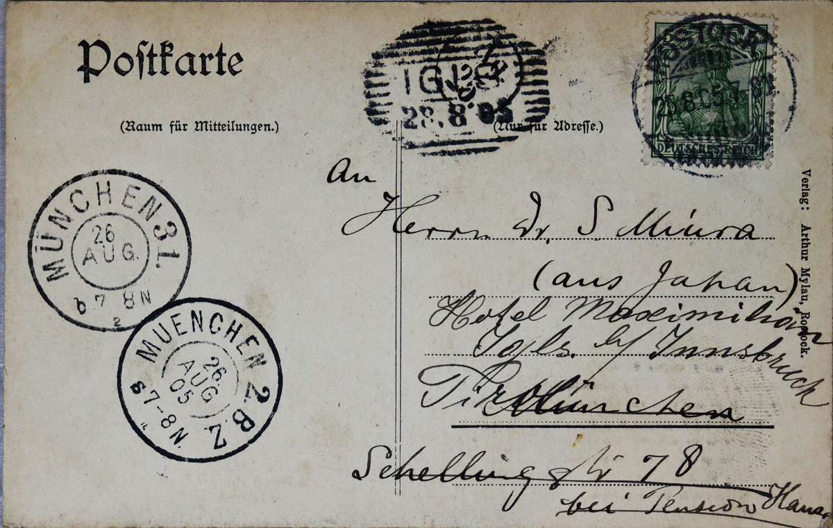 内容:近況報告(旅行報告)。/絵種別:写真/絵分類:風景/絵国名:ドイツ/絵内容:ロストック|港/絵柄の種類:風景(ドイツ)/留学期間:ミュンヘン大学時代/三浦と葉書の関係:三浦宛