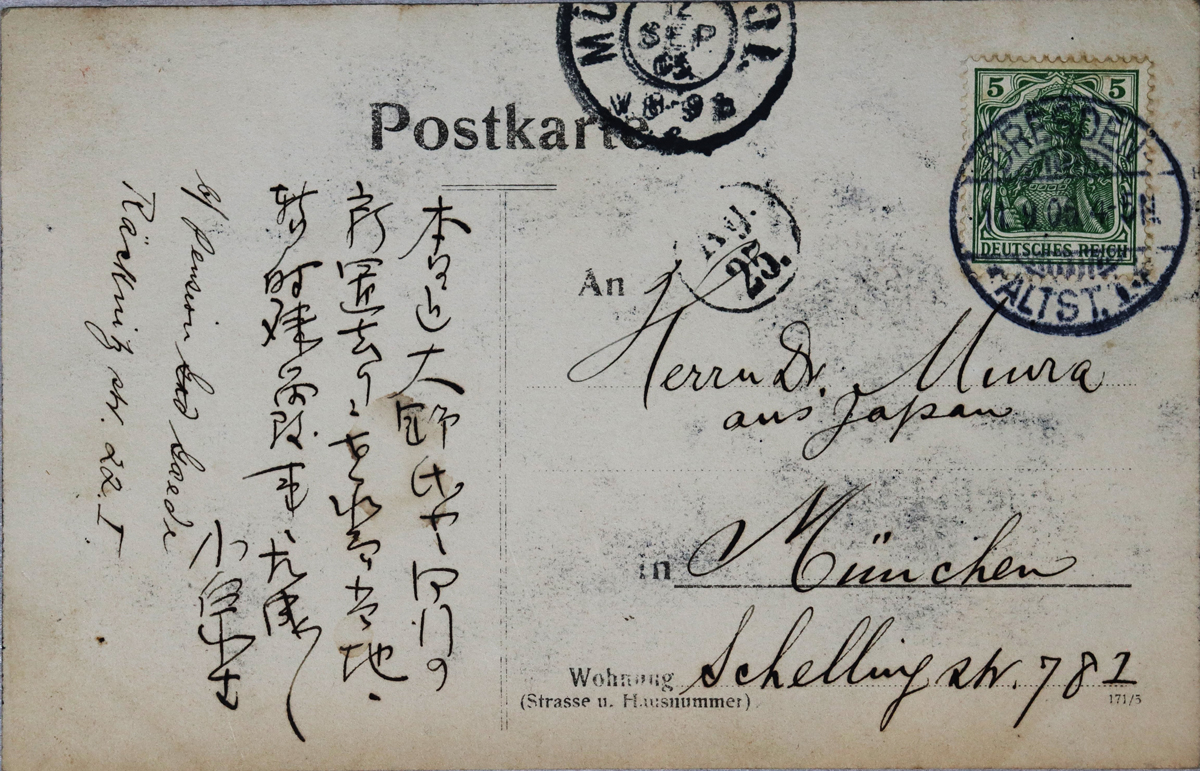 - 内容:本日ヤンタウを引払い、ドレスデンに来た。/絵種別:写真/絵分類:風景/絵国名:ドイツ/絵内容:名勝/絵柄の種類:風景(ドイツ)/留学期間:ミュンヘン大学時代/三浦と葉書の関係:三浦宛