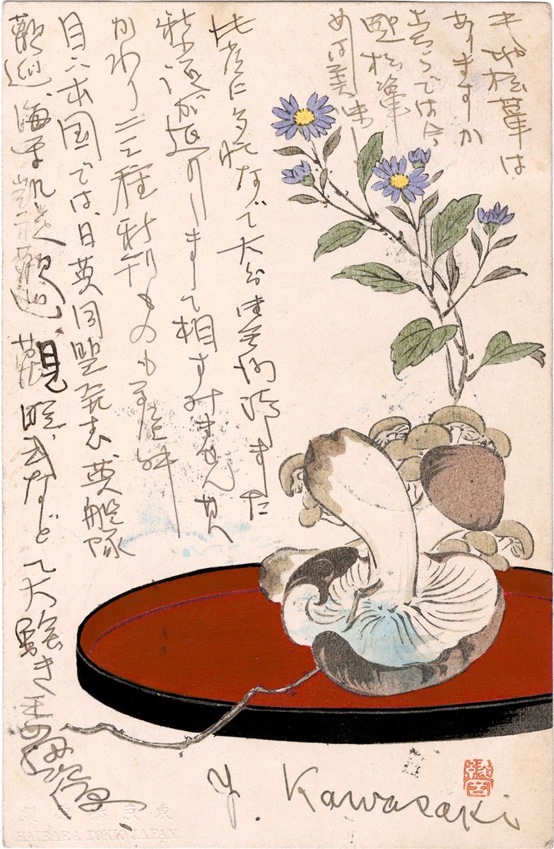 - 内容:松茸はあるかどうかの問い合わせ。日英同盟を巡る近況報告。/絵種別:絵/絵分類:文化/絵国名:日本/絵内容:きのこ|シイタケ|シメジ|キノコ|ミヤコワスレ|花|盆/絵柄の種類:文化/留学期間:ミュンヘン大学時代/三浦と葉書の関係:三浦宛