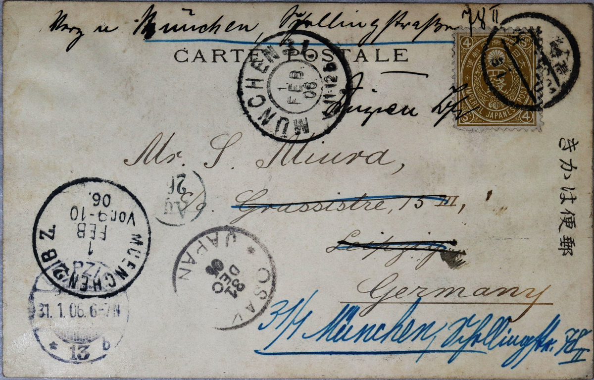 - 内容:年賀状(日本銀行大阪支店)。/絵種別:写真/絵分類:風景/絵国名:日本/絵内容:日本銀行大阪支店/絵柄の種類:風景(日本)/留学期間:ミュンヘン大学時代/三浦と葉書の関係:三浦宛