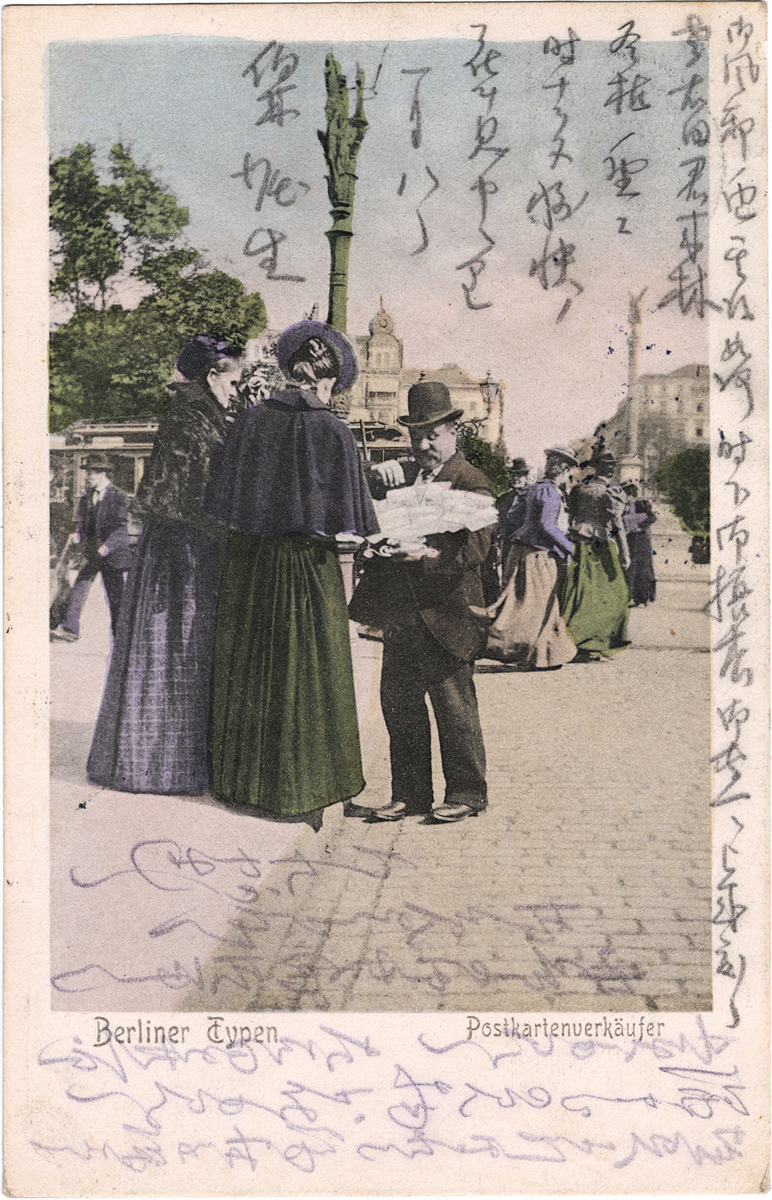 - 内容:新七の風邪の状況を心配する記述、左右田君ベルリン来訪の記載(堀)。ベルリン見物に関する記載(左右田)。/絵種別:写真/絵分類:文化/絵国名:ドイツ/絵内容:ベルリン|絵葉書売り/絵柄の種類:文化/留学期間:ミュンヘン大学時代/三浦と葉書の関係:三浦宛