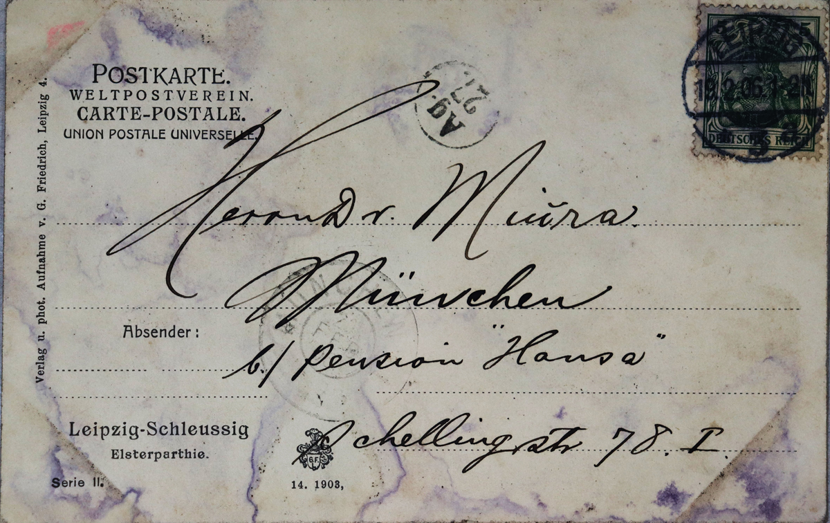 - 内容:挨拶状。風邪気味の由、大切に願いたい。今後何カ月ほどご滞在かうかがいたい。/絵種別:写真/絵分類:風景/絵国名:ドイツ/絵内容:ライプチッヒ|川|船着場/絵柄の種類:風景(ドイツ)/留学期間:ミュンヘン大学時代/三浦と葉書の関係:三浦宛