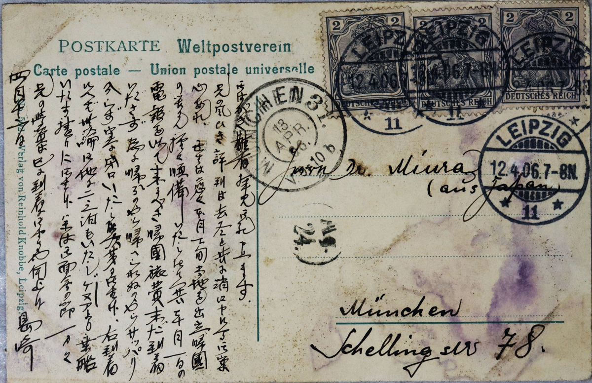 - 内容:手紙拝見。本月下旬帰国のつもりなれど帰国旅費未着。君の所には学費は着いたか。/絵種別:写真/絵分類:風景/絵国名:ドイツ/絵内容:ライプツィヒ|音楽都市|鳥|ハープ|男性|デザイン/絵柄の種類:風景(ドイツ)/留学期間:ミュンヘン大学時代/三浦と葉書の関係:三浦宛
