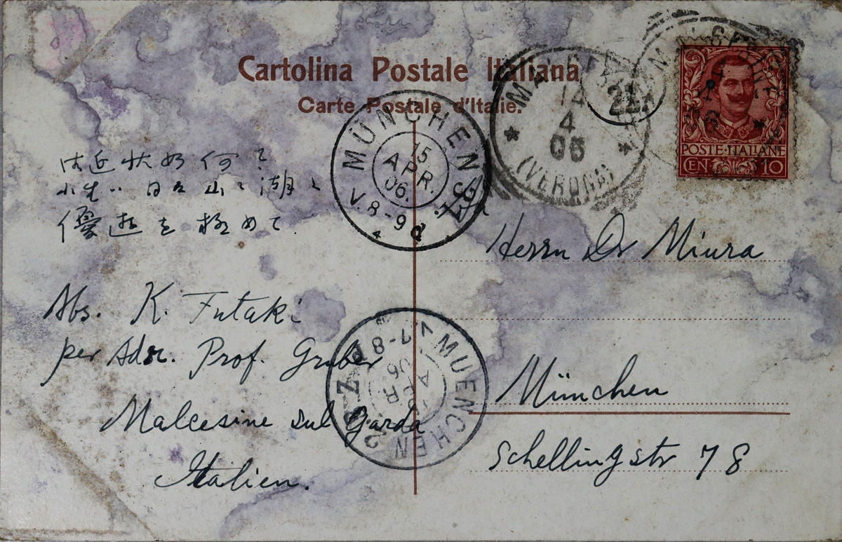 - 内容:挨拶状。小生は日々山に湖に優遊を極めている。/絵種別:写真/絵分類:風景/絵国名:イタリア/絵内容:イタリア|マルチェジネ/絵作者・発行社:B.Lehrburger,Nürunberg/絵柄の種類:風景(その他)/留学期間:ミュンヘン大学時代/三浦と葉書の関係:三浦宛