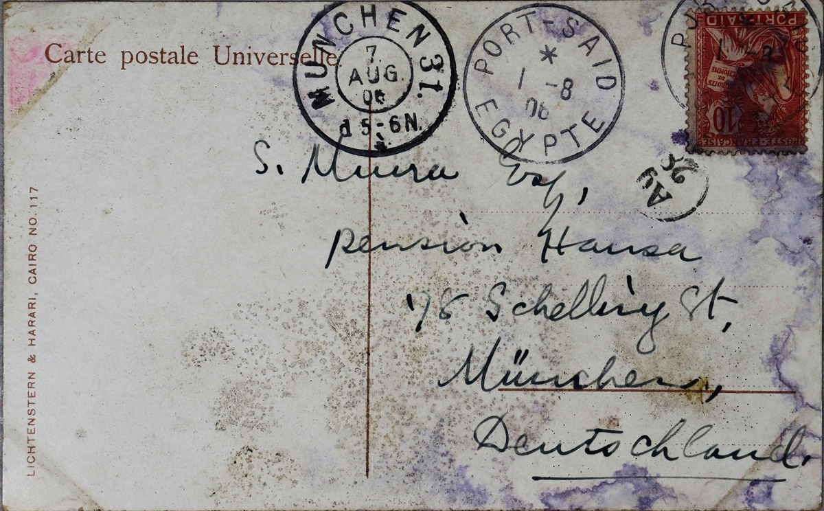- 内容:近況報告。キルトセット宛の手紙を見た。/絵種別:写真/絵分類:風景/絵国名:エジプト/絵内容:カイロ|ピラミッド|スフィンクス/絵柄の種類:風景(その他)/留学期間:ミュンヘン大学時代/三浦と葉書の関係:三浦宛