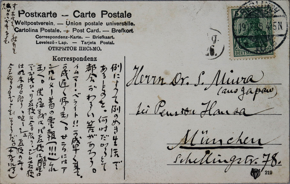 - 内容:近況報告。各教授の講義日程。藤井生の18日のハガキを読む。/絵種別:写真/絵分類:風景/絵国名:ドイツ/絵内容:ベルリン|大聖堂|ルストガルテン/絵柄の種類:風景(ドイツ)/留学期間:ミュンヘン大学時代/三浦と葉書の関係:三浦宛