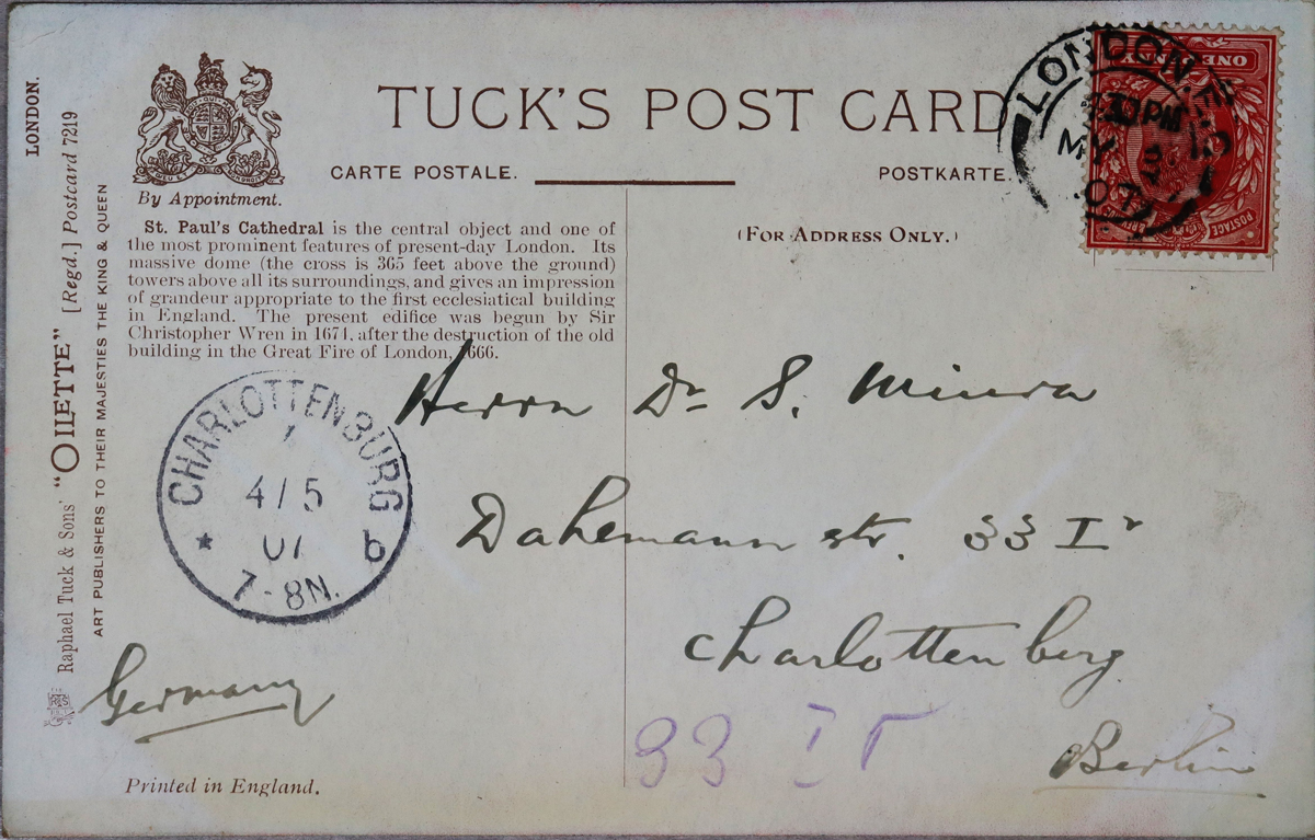 - 内容:過日、西尾のことで手数をかけた。内池兄の宿所わからぬが、面会の折にはよろしく。/絵種別:絵/絵分類:風景/絵国名:イギリス/絵内容:ロンドン|セントポール大聖堂|Ludgate Circus/絵作者・発行社:? /絵柄の種類:風景(その他)/留学期間:ベルリン大学時代/三浦と葉書の関係:三浦宛