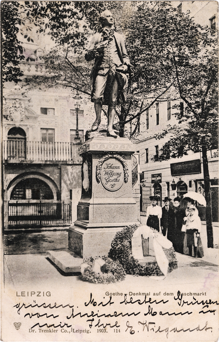 内容:<ドイツ語文章>/絵種別:写真/絵分類:風景/絵国名:ドイツ/絵内容:ライプツィヒ|ゲーテ像|広場|Naschmarkt/絵柄の種類:風景(ドイツ)/留学期間:ベルリン大学時代/三浦と葉書の関係:三浦宛