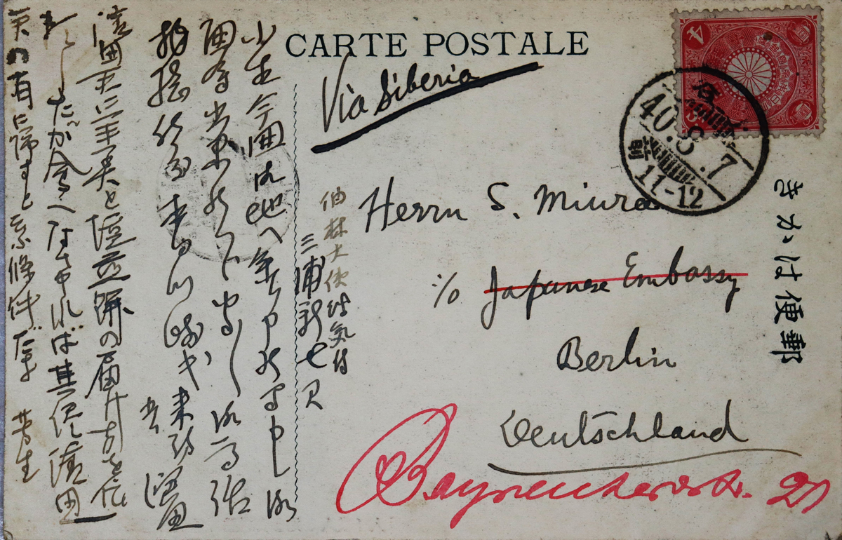 - 内容:御地へ行くので面会してもらいたい。本日川崎氏来訪(浜田)。浜田に羊羹・塩煎餅を届けるように頼んだ。新七に会えない場合、これらは浜田のものになる(芳)。/絵種別:写真/絵分類:風景/絵国名:日本/絵内容:活動写真|群衆|三越呉服店主催/絵柄の種類:風景(日本)/留学期間:ベルリン大学時代/三浦と葉書の関係:三浦宛