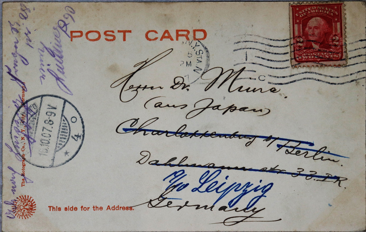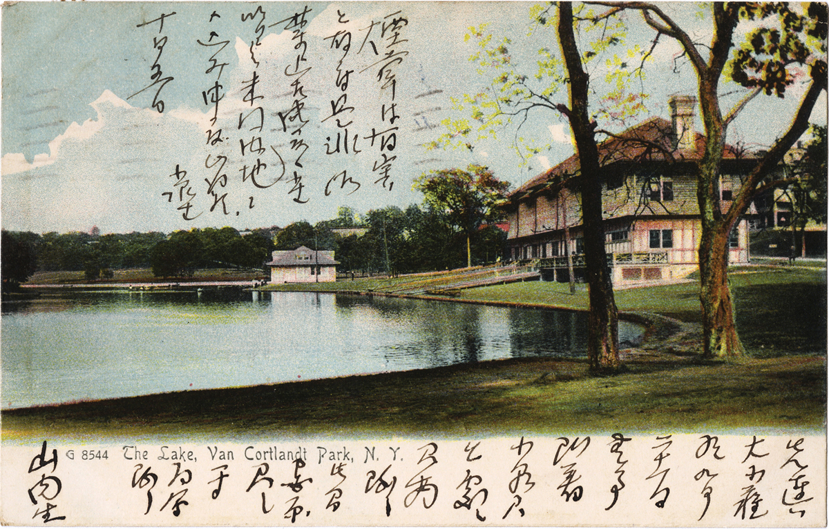- 内容:9月21日に無事当地に到着、宮原君と面会した(山内)。煙草は有害、是非やめ給え。明日は米国内地に入る(小泉)。/絵種別:写真/絵分類:風景/絵国名:アメリカ/絵内容:ニューヨーク|ヴァンコートランドパーク|湖/絵柄の種類:風景(その他)/留学期間:再びライプチヒ大学時代/三浦と葉書の関係:三浦宛