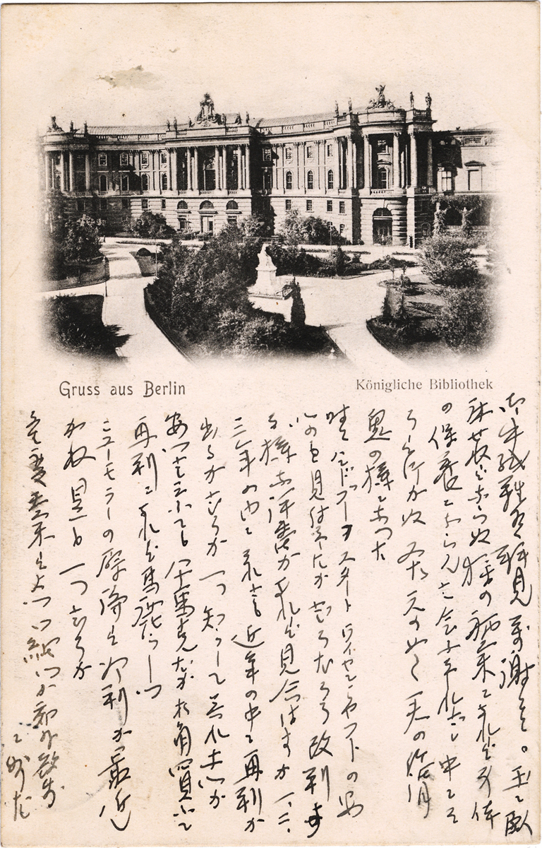 - 内容:昨今の大学、近況はどうか。学校通いで一生暮らすのも面白くないものだ。/絵種別:写真/絵分類:風景/絵国名:ドイツ/絵内容:ベルリン|王立図書館/絵柄の種類:風景(ドイツ)/留学期間:再びライプチヒ大学時代/三浦と葉書の関係:三浦宛