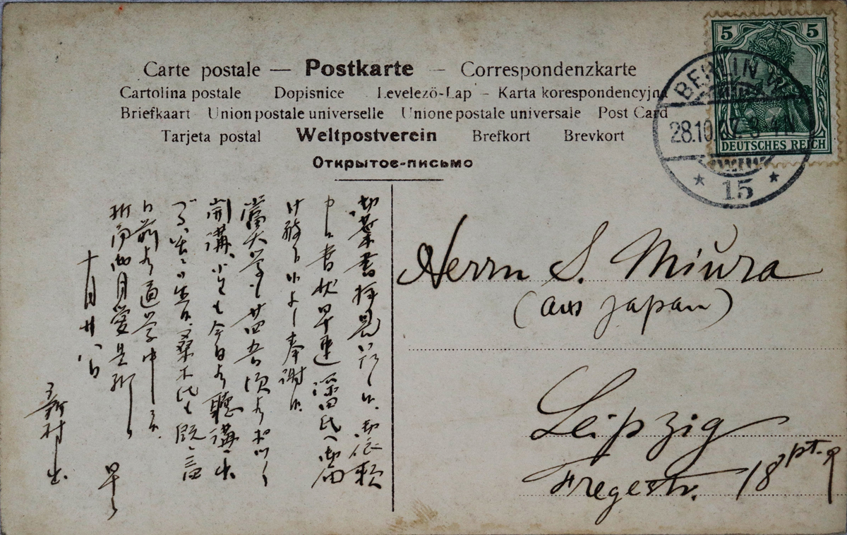 - 内容:深田氏に書簡を届けてくれたことに対する礼状。当大学もポツポツ開講。桑木君も通学を始めた。 (地番を誤記)/絵種別:写真/絵分類:文化/絵国名:ドイツ/絵内容:女性|演劇|Tannhäuser|Lucia|Rierschner|Uebanska/絵作者・発行社:Zander&Labisch/絵柄の種類:文化/留学期間:再びライプチヒ大学時代/三浦と葉書の関係:三浦宛