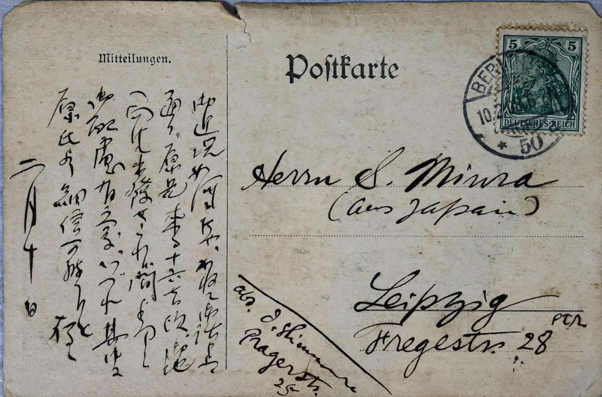 - 内容:来る16~17日頃原兄御地に行く。よろしく。/絵種別:その他/絵分類:文化/絵国名:ドイツ/絵内容:地図|ベルリン|市街地|近郊|路線図/絵作者・発行社:Richard Rosalowsky/絵柄の種類:文化/留学期間:再びライプチヒ大学時代/三浦と葉書の関係:三浦宛