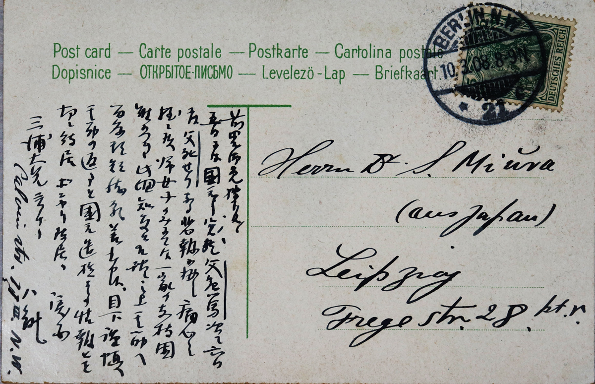 - 内容:父死去の報に接し、留学短縮願いを出した。/絵種別:写真/絵分類:風景/絵国名:ドイツ/絵内容:ベルリン|ポツダム橋|路面電車/絵柄の種類:風景(ドイツ)/留学期間:再びライプチヒ大学時代/三浦と葉書の関係:三浦宛