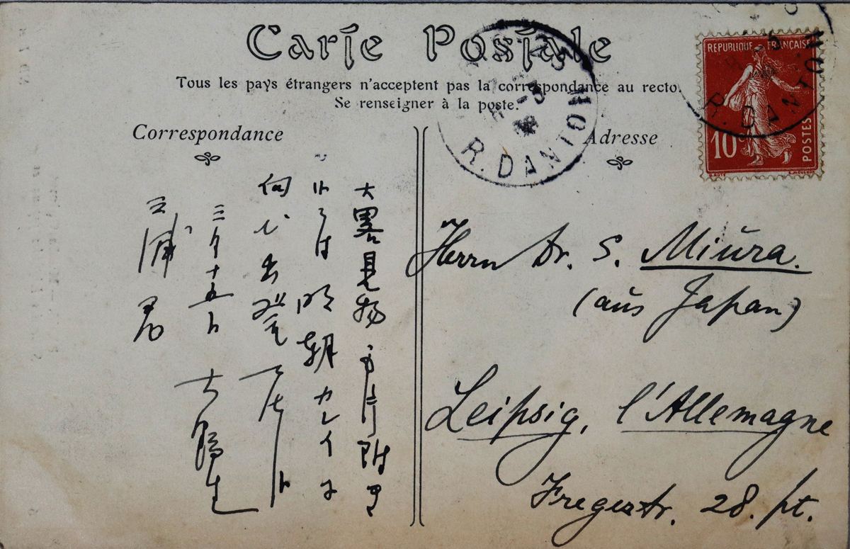 - 内容:明朝カレイに向けて出発。/絵種別:写真/絵分類:風景/絵国名:フランス/絵内容:パリ|ギメ美術館|展示室|仏像/絵作者・発行社:ND/絵柄の種類:風景(その他)/留学期間:再びライプチヒ大学時代/三浦と葉書の関係:三浦宛