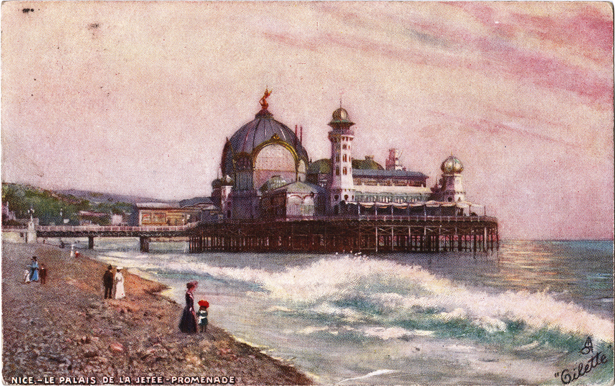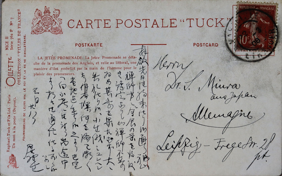 - 内容:お約束の福山禅師宅の食事会、その意を果たさず失礼した。ミュンヘン経由で当地に到着した。これよりパリに向かう。また便りを出す。/絵種別:写真/絵分類:風景/絵国名:フランス/絵内容:ニース|観光施設|Jetée-PromenadedeNice/絵柄の種類:風景(その他)/留学期間:再びライプチヒ大学時代/三浦と葉書の関係:三浦宛