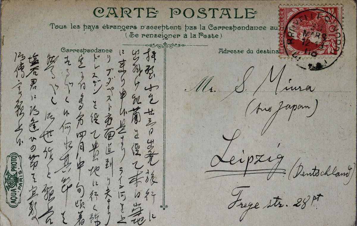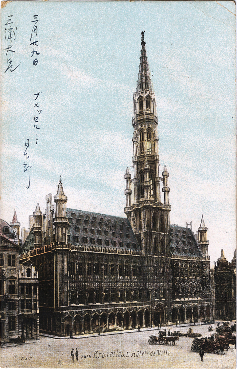 - 内容:4月中旬御地に行く。塩谷君によろしく。/絵種別:写真/絵分類:風景/絵国名:ベルギー/絵内容:ブリュッセル|Hotel de Ville/絵柄の種類:風景(その他)/留学期間:再びライプチヒ大学時代/三浦と葉書の関係:三浦宛