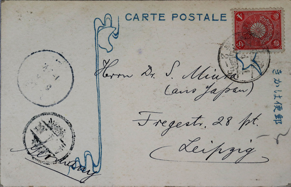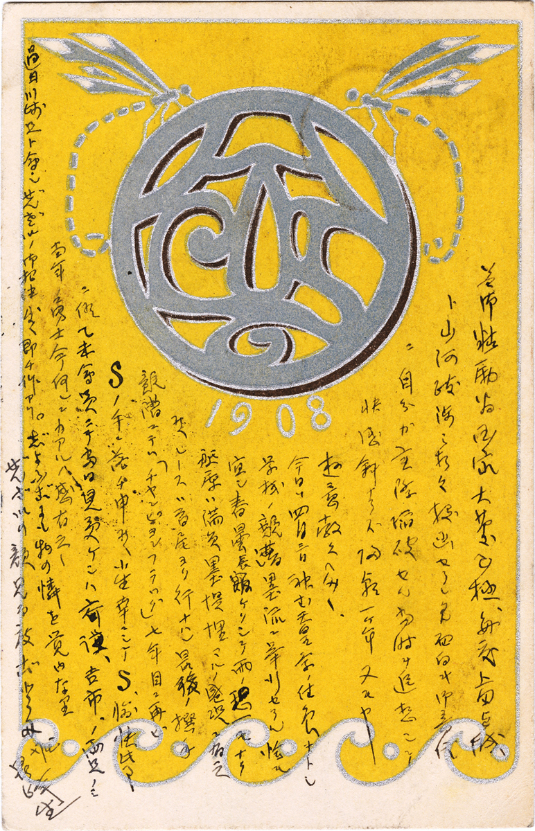 - 内容:近況報告(墨堤競漕の模様)。/絵種別:イラスト/絵分類:文化/絵国名:日本/絵内容:鍔|1908|トンボ|波|デザイン/絵柄の種類:文化/留学期間:再びライプチヒ大学時代/三浦と葉書の関係:三浦宛