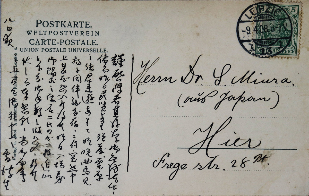 - 内容:ミュンヘンより須藤・栗原の両君が来る。曲馬見物の入場券2枚追加の手配頼む。/絵種別:写真/絵分類:風景/絵国名:ドイツ/絵内容:ライプツィヒ|Johannisplatz|大通り/絵柄の種類:風景(ドイツ)/留学期間:再びライプチヒ大学時代/三浦と葉書の関係:三浦宛