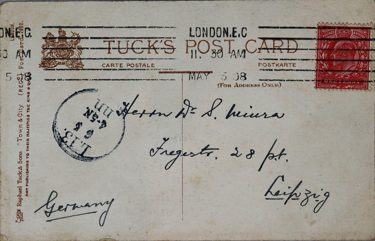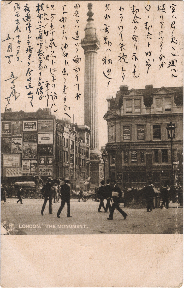 - 内容:三浦新七のところに立ち寄れなかったことのお詫びと欧州滞在の感想。/絵種別:写真/絵分類:風景/絵国名:イギリス/絵内容:ロンドン|ロンドン大火記念塔/絵柄の種類:風景(その他)/留学期間:再びライプチヒ大学時代/三浦と葉書の関係:三浦宛