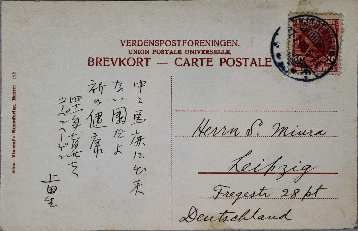 - 内容:近況報告。中々馬鹿に出来ない国だよ。/絵種別:写真/絵分類:風景/絵国名:デンマーク/絵内容:コペンハーゲン|新港/絵柄の種類:風景(その他)/留学期間:再びライプチヒ大学時代/三浦と葉書の関係:三浦宛