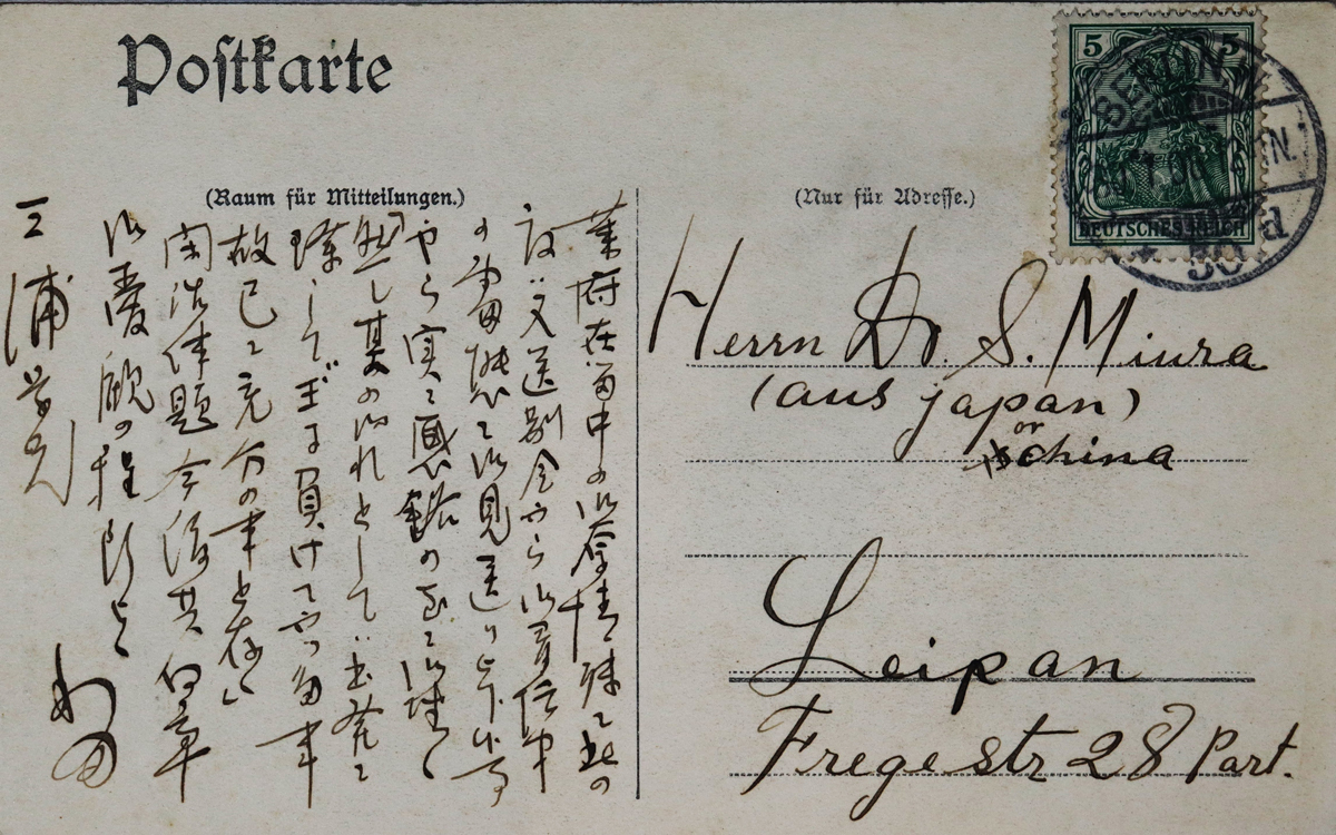 - 内容:ライプチッヒ滞在中のご厚情、送別会、お見送り誠にありがとう。/絵種別:写真/絵分類:風景/絵国名:ドイツ/絵内容:ベルビュー宮殿への道|並木道/絵作者・発行社:L.Saalfeld,Berlin/絵柄の種類:風景(ドイツ)/留学期間:再びライプチヒ大学時代/三浦と葉書の関係:三浦宛
