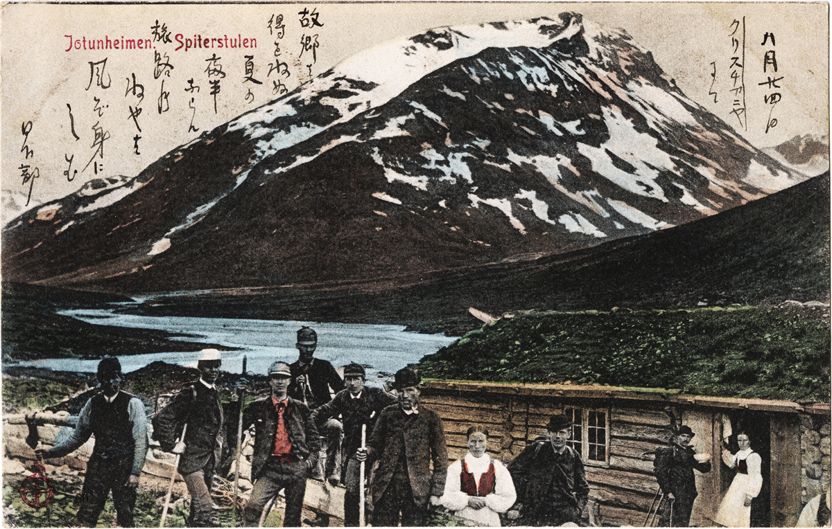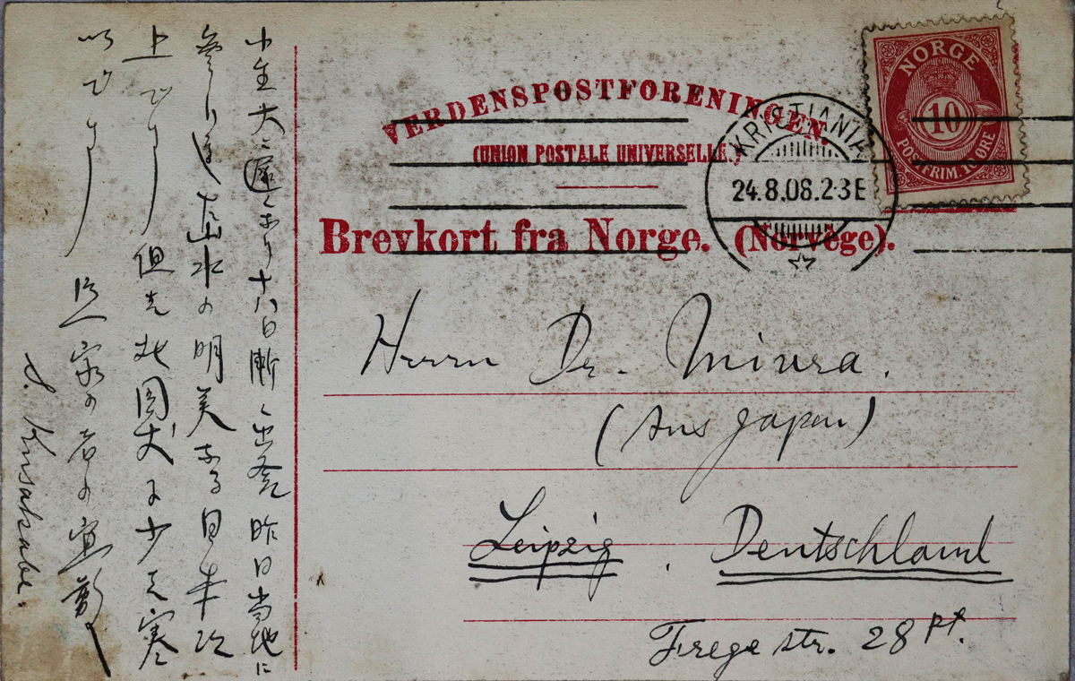 - 内容:当地到着の報告。裏面に歌一首を認めている。/絵種別:写真/絵分類:風景/絵国名:ノルウェー/絵内容:オスロ|ヨーツンヘイム|山小屋|Spiterstulen/絵柄の種類:風景(その他)/留学期間:再びライプチヒ大学時代/三浦と葉書の関係:三浦宛