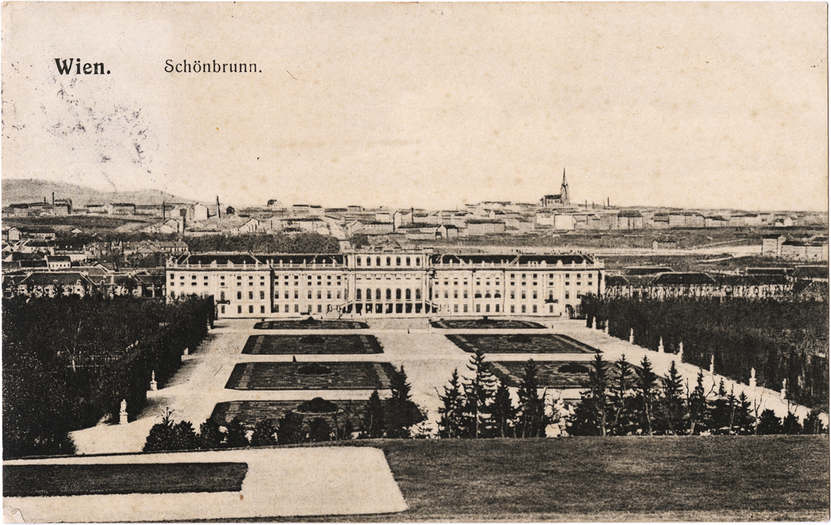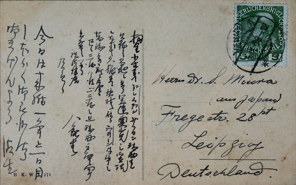 - 内容:ドレスデン、ザクセン、スイスを見物して当地に来た。早速奥山兄の世話になっている(八鍬)。今日はウィーンに来て1年1日目。ご無沙汰している。御機嫌よう(奥山)。/絵種別:写真/絵分類:風景/絵国名:オーストリア/絵内容:ウィーン|シェーンブルン宮殿/絵柄の種類:風景(その他)/留学期間:再びライプチヒ大学時代/三浦と葉書の関係:三浦宛