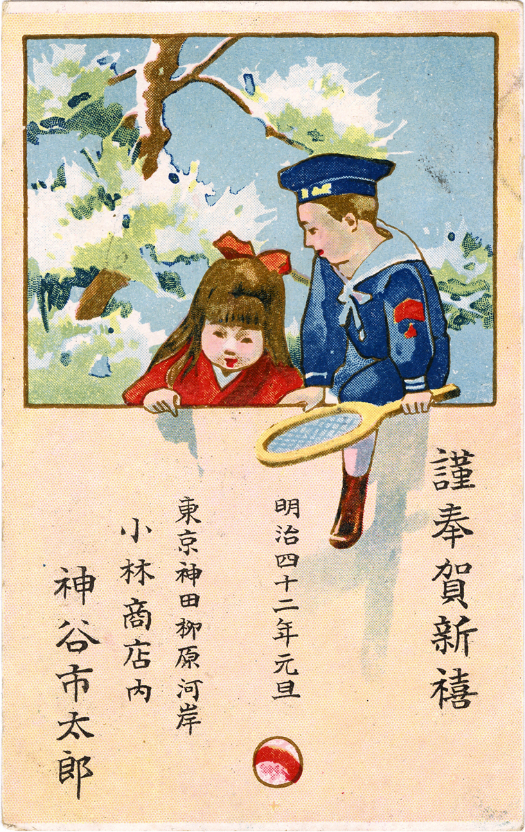 - 内容:年賀状/絵種別:イラスト/絵分類:文化/絵国名:日本/絵内容:少年|少女|テニス|年賀状/絵柄の種類:文化/留学期間:再びライプチヒ大学時代/三浦と葉書の関係:三浦宛